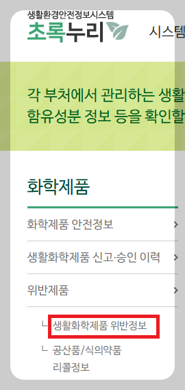 초록누리 홈페이지에 접속하시면 상위 메뉴에서 ✅화학제품을 누르시고 하위메뉴중 ✅위반제품- ✅생활화학제품 위반정보에서 찾아보실 수 있습니다.