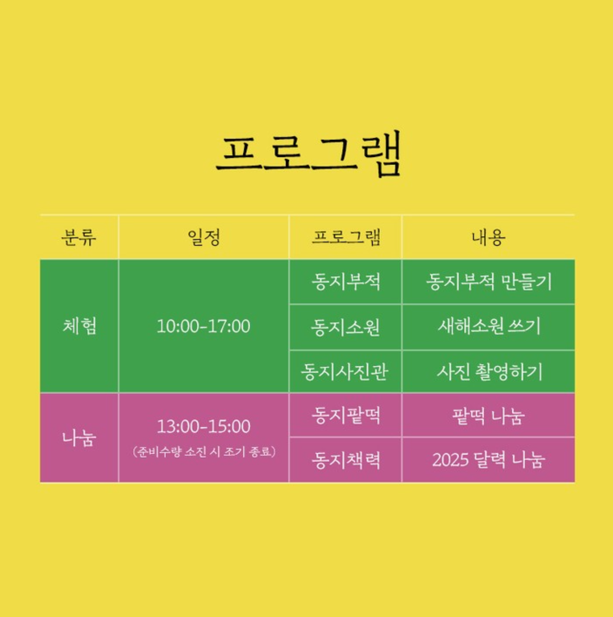 오전 10시부터 체험일정이 준비되어 있고, 오후에는 동지팥떡과 동지책력 나눔도 합니다. 준비수량 소진 시 조기종료되오니 빠르게 움직이는 것이 좋을 것 같습니다.