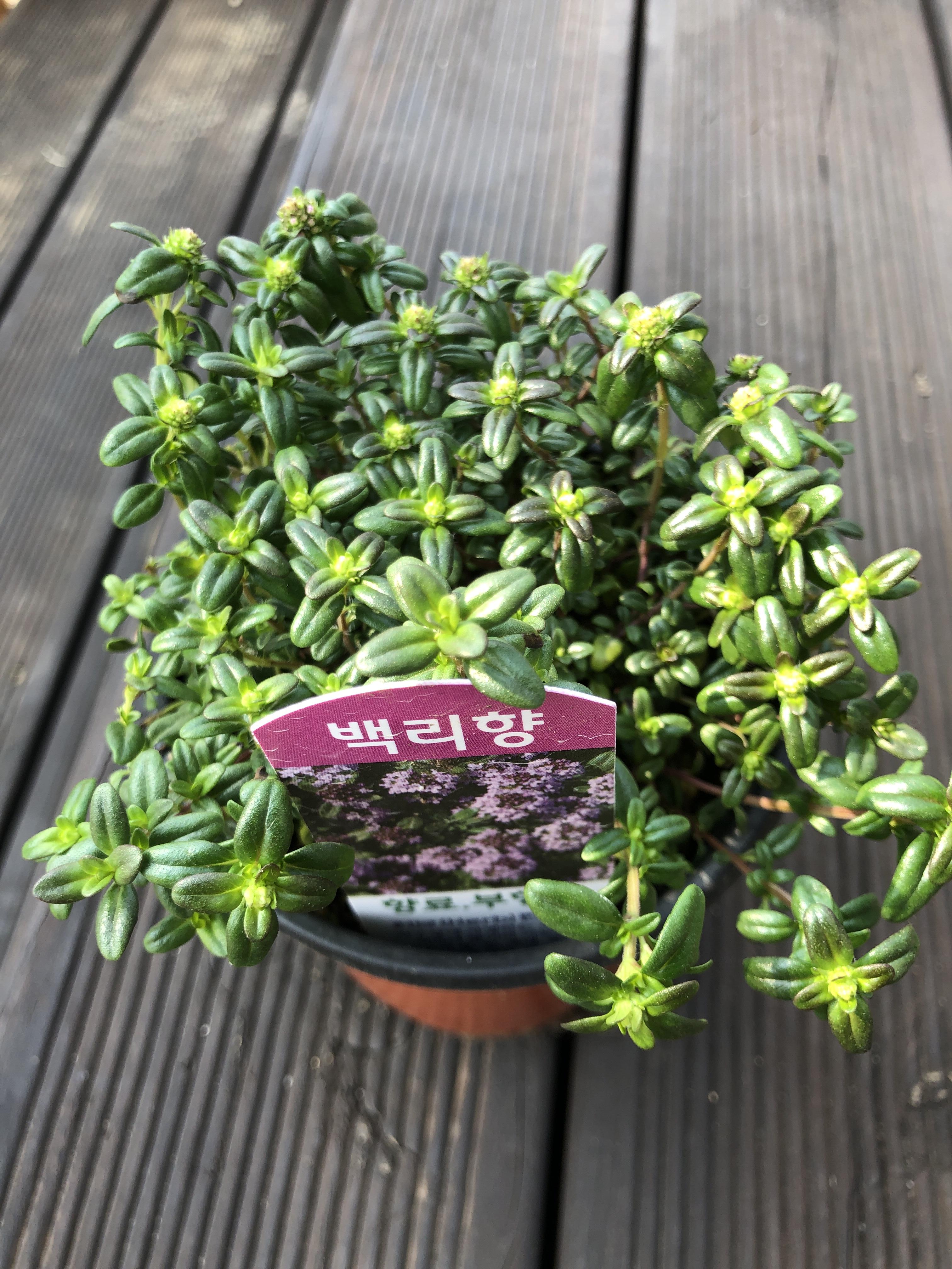 이 식물의 이름에서 느끼셨나요? 향기가 백리까지 간다고 해서 백리향이라고 이름이 붙은 식물입니다. 그만큼 스치기만 해도 여느 허브처럼 향이 발산됩니다. 허브과의 식물로 식용이 가능하며, 주로 요리나 차로 이용됩니다. 또한 번식속도도 빠르고 땅에 붙어 낮게 자라기 때문에 지피식물로 사용하기에도 손색이 없습니다. 게다가 추위에도 강한 편이라 한겨울 노지에서도 완전히 누렇게 잎이 죽지 않고 반상록상태로 겨울을 나게 됩니다. 백리향은 3~6월에 꽃을 피우게 되며, 벌들이 아주 좋아하는 밀원식물 중에 하나입니다.