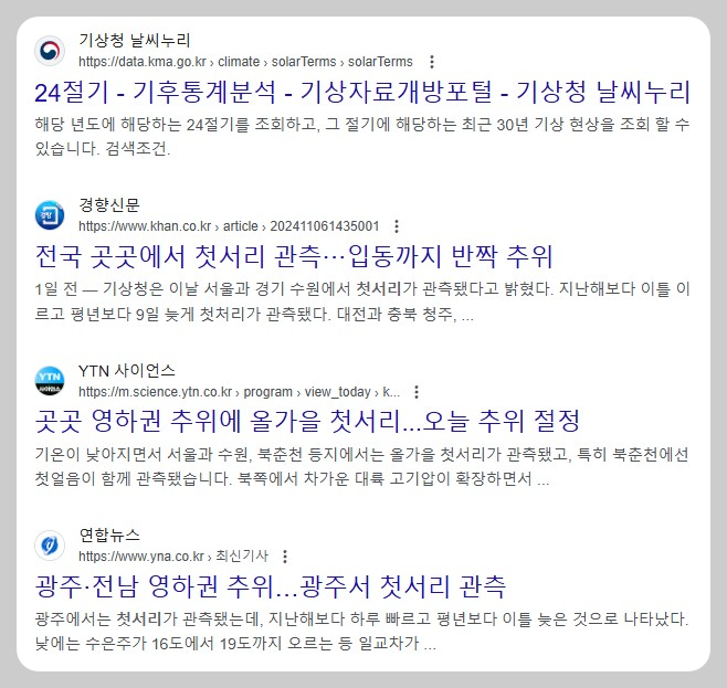 11월 7일 첫서리 관측 뉴스 - 구글 페이지 캡쳐