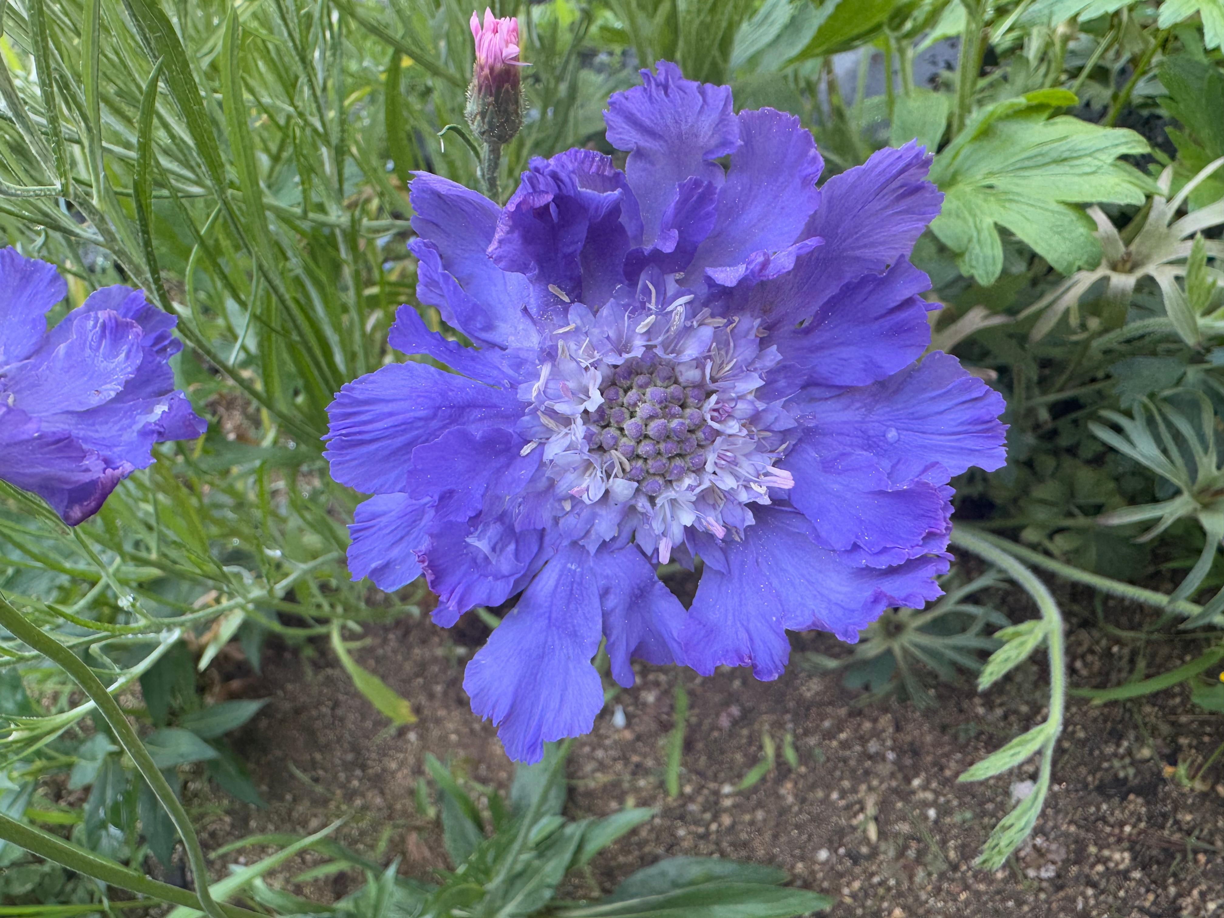 스카비오사는 높이감이 있는 꽃이라, 팬지나 비올라 같은 낮은 키의 식물과 조화가 좋습니다. 같은 계열의 라벤더, 에키네시아, 제라늄 등과도 잘 어울리고요. 저는 저 위에 정식한 사진에 주변으로 겹양귀비꽃을 심어 함께 높이 있는 꽃으로 배열해도 좋았습니다. 키와 상관없이 같은 파스텔 톤 꽃들과 조합하면 자연스러우면서도 고급스러운 분위기를 연출할 수 있습니다.