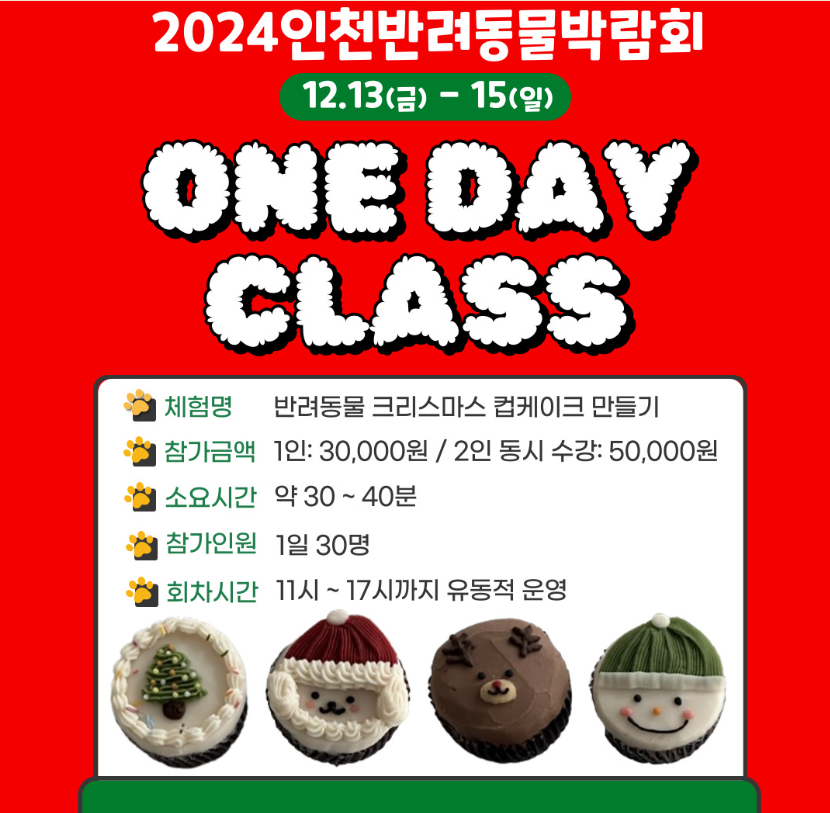 이번 인천 반려동물 박람회에서는 아로마제품 만들기와 크리스마스 컵케이크 만들기가 준비되어 있습니다. 연말에 크리스마스라 컵케이크 만들기도 의미 있어 보이는데요, 참가인원이 일일 30명이라 정보 잘 확인하시고 참가해 보셔도 좋을 것 같습니다.