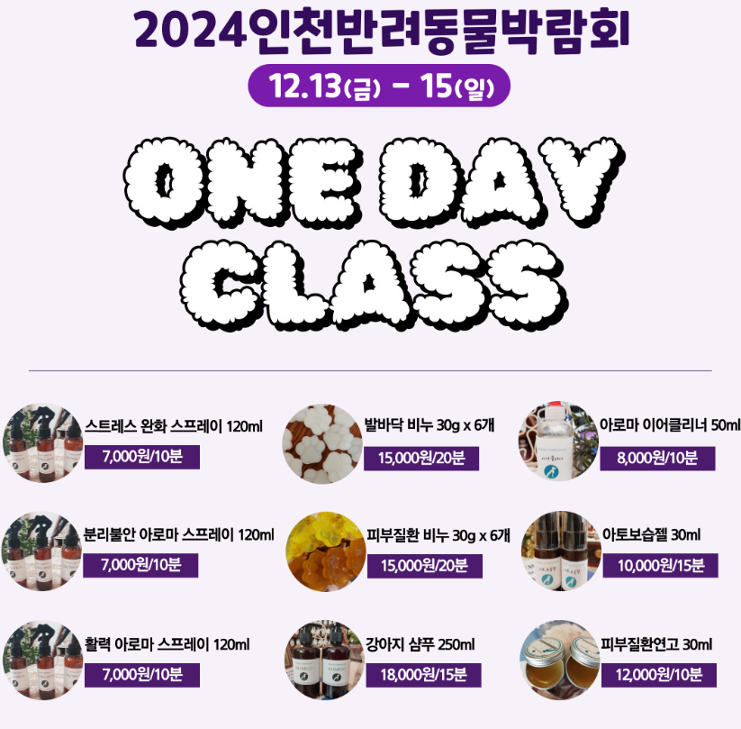 이번 인천 반려동물 박람회에서는 아로마제품 만들기와 크리스마스 컵케이크 만들기가 준비되어 있습니다. 연말에 크리스마스라 컵케이크 만들기도 의미 있어 보이는데요, 참가인원이 일일 30명이라 정보 잘 확인하시고 참가해 보셔도 좋을 것 같습니다.