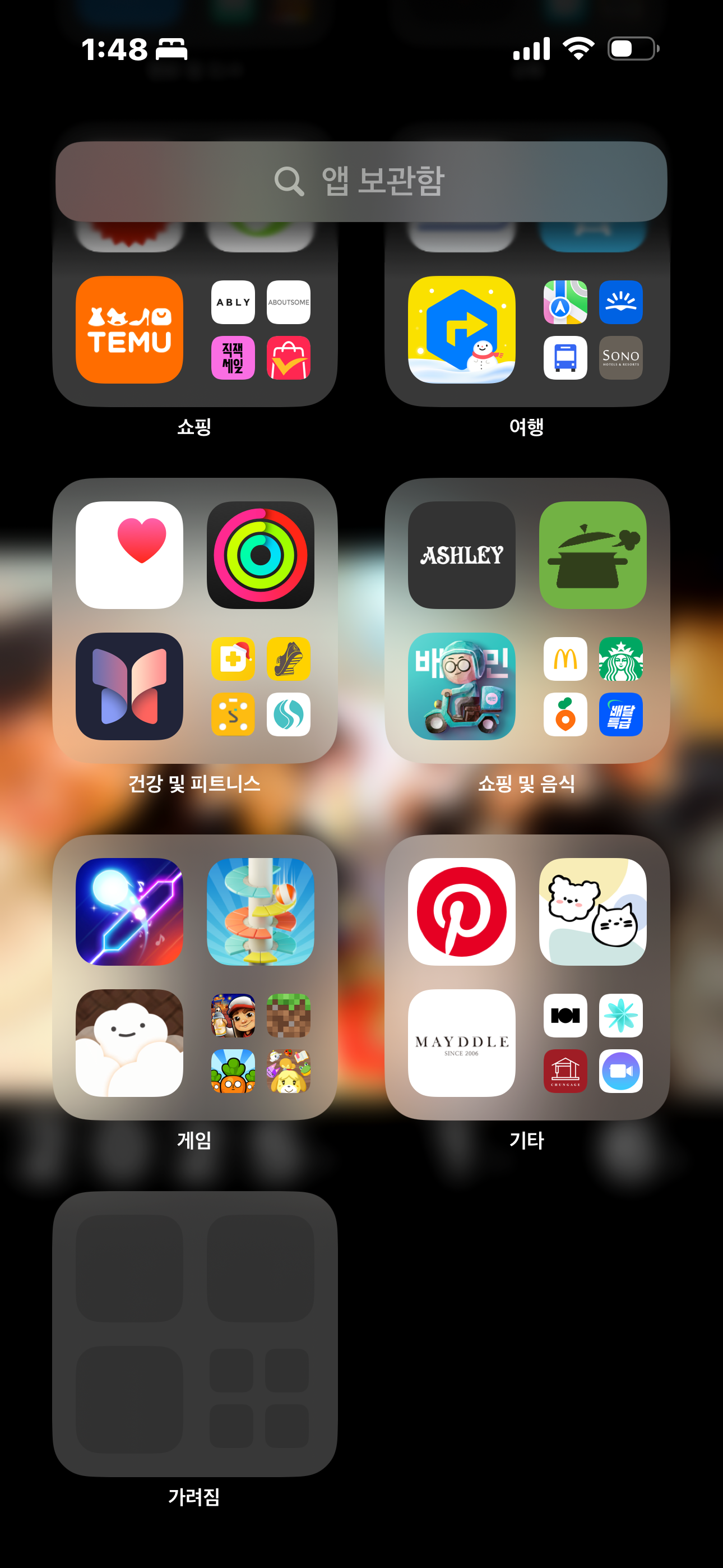 📌이후에 오른쪽 앱 보관함으로 쭉 화면을 밀어 옮기면 가리기 처리된 가려짐이라는 폴더가 맨 아래 보입니다. 어떤 앱이 있는지 보이지 않기 때문에 가려짐으로 처리가 완료된 것을 알 수 있습니다. 바로 사용하시기 위해선 가려짐 폴더를 한번 누르면 바로 Face ID가 활성화되면서 폴더 안의 앱들이 확인됩니다.
