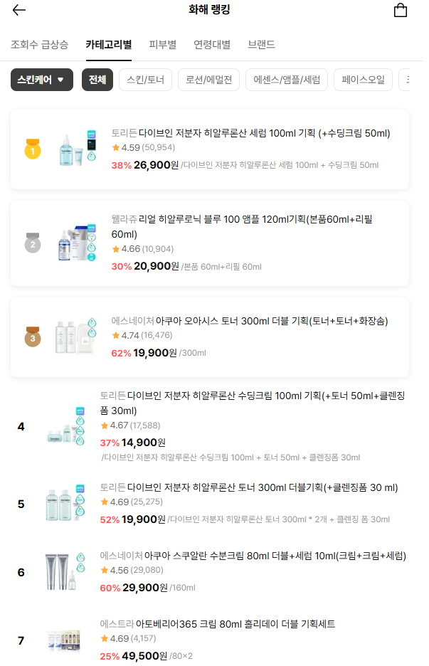 화해 홈페이지에서 스킨케어 제품 1~2위가 모두 히알루론산이 함유된 제품입니다. 아래 이미지를 누르면 화해 홈페이지로 이동합니다.