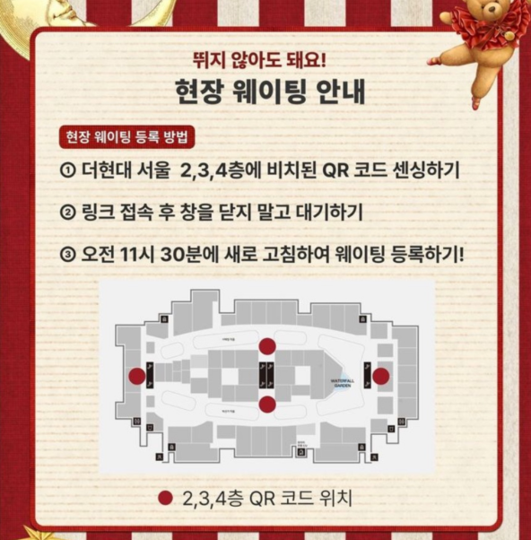 더현대 서울 2,3,4층에 비치된 QR코드로 11시 30분부터 웨이팅 등록가능합니다.