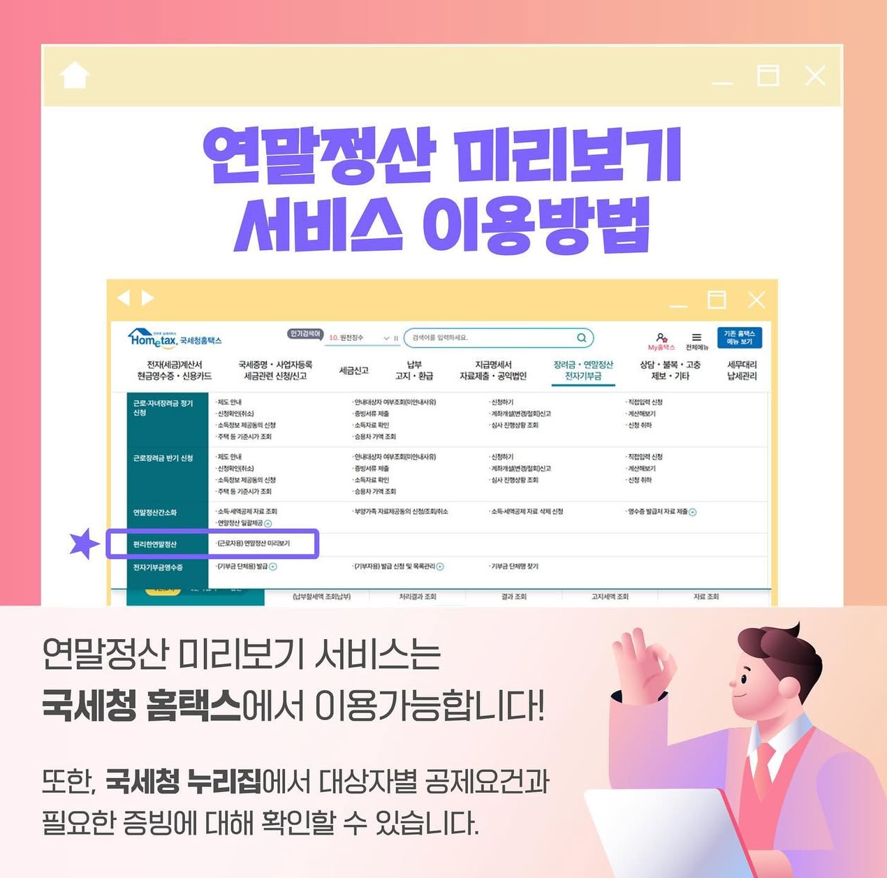 2024년 연말정산 미리 보기 서비스로 편하게 13월의 월급 받으세요! 더불어 올해 달라지는 연말정산 공제내용도 꼭 확인해 보세요.