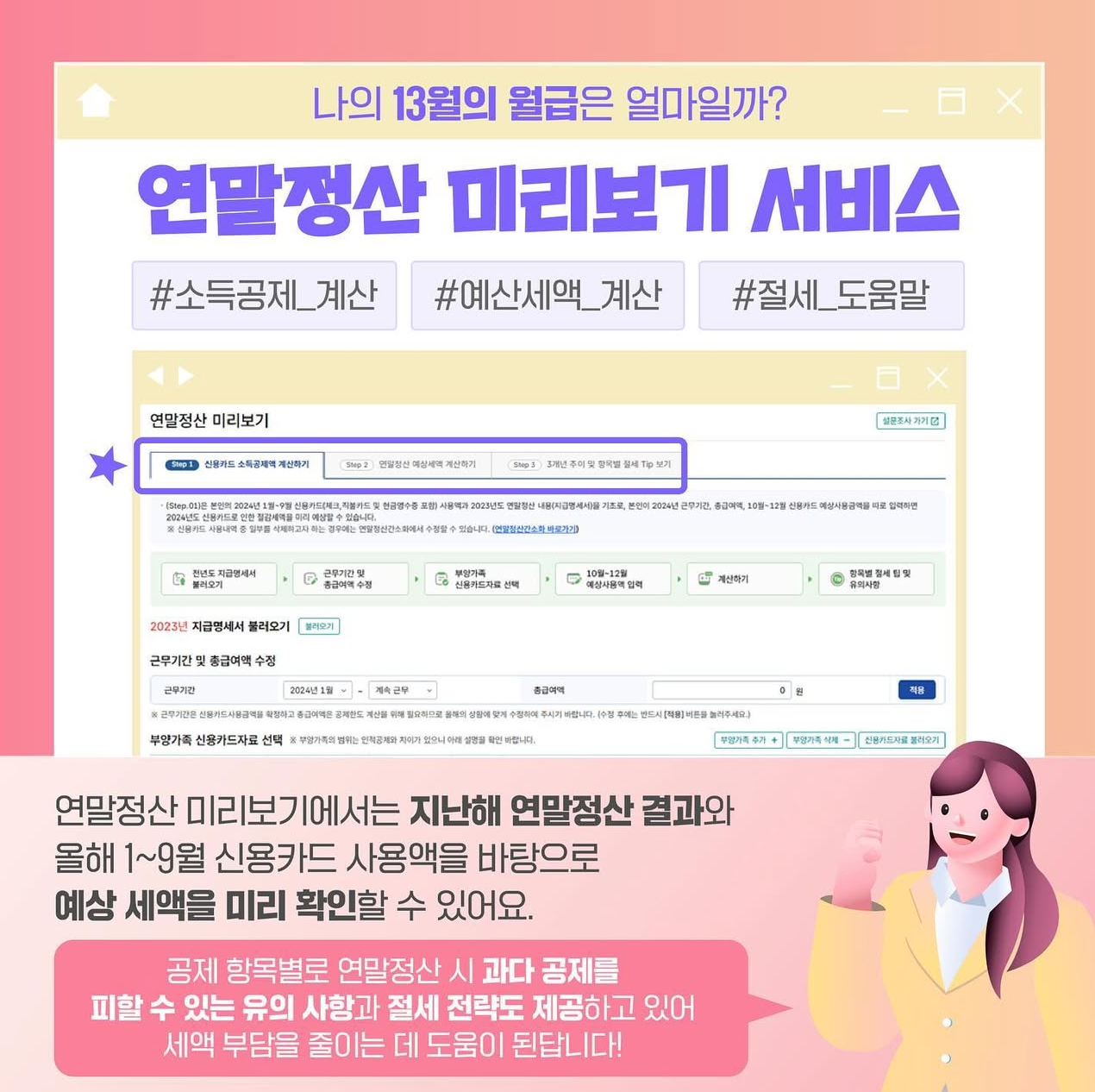 2024년 연말정산 미리 보기 서비스로 편하게 13월의 월급 받으세요! 더불어 올해 달라지는 연말정산 공제내용도 꼭 확인해 보세요.