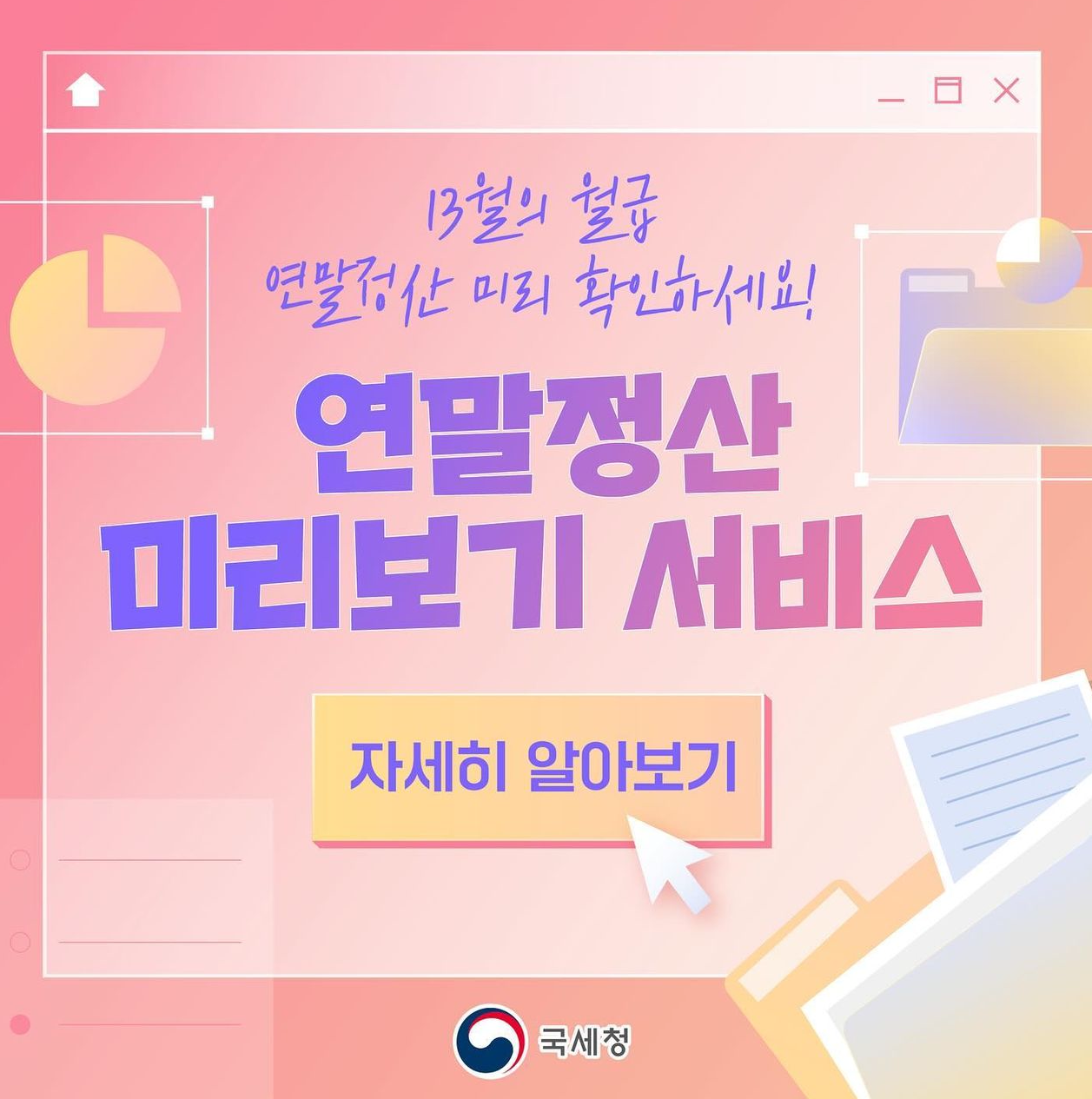 아래 버튼을 누르면 연말정산 미리 보기 서비스로 바로갈 수 있습니다. 내용 잘 확인하시고 미리보기 서비스로 간편하게 연말정산받아보세요.