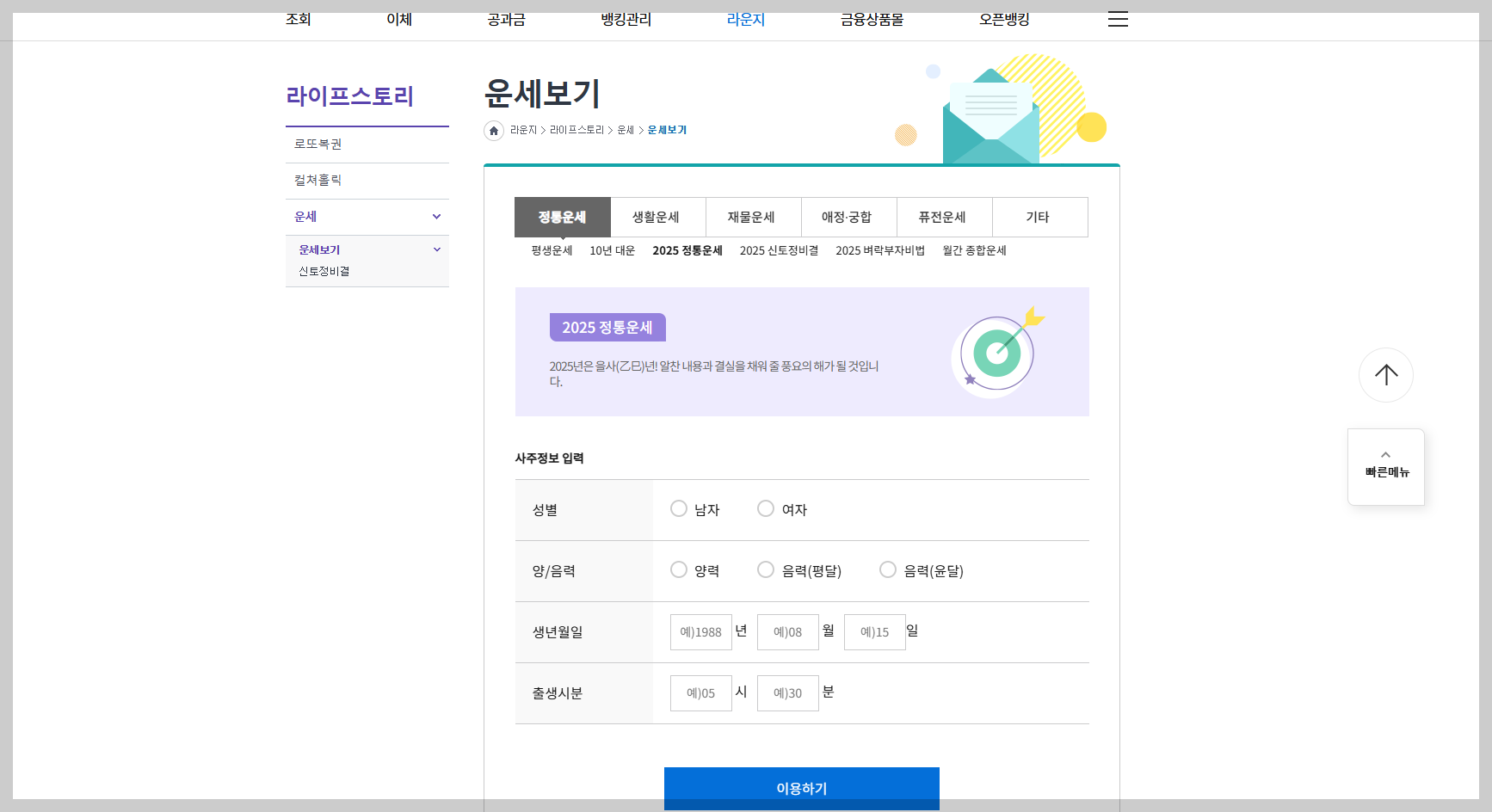 운세서비스로 진입합니다. 2025년 운세로는 정통운세와 신토정비결을 볼 수 있습니다. 왼쪽의 정통운세 메뉴를 눌러보겠습니다. 개인 사주정보를 입력한 후 이용하기 버튼을 누르시면 됩니다.