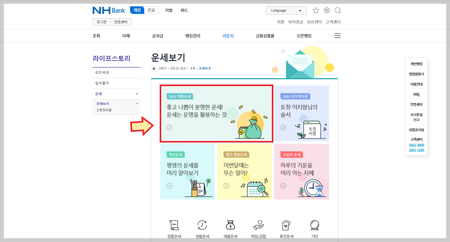 농협은행에서 제공하는 운세는 2025년 운세 말고도 꿈해몽, 월간종합운세, 오늘의 재물운, 띠운세, 별자리 운세등 많은 서비스를 제공하고 있습니다.